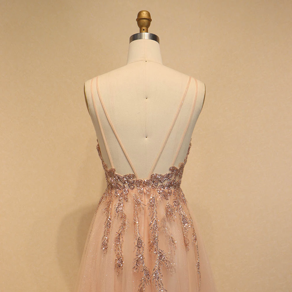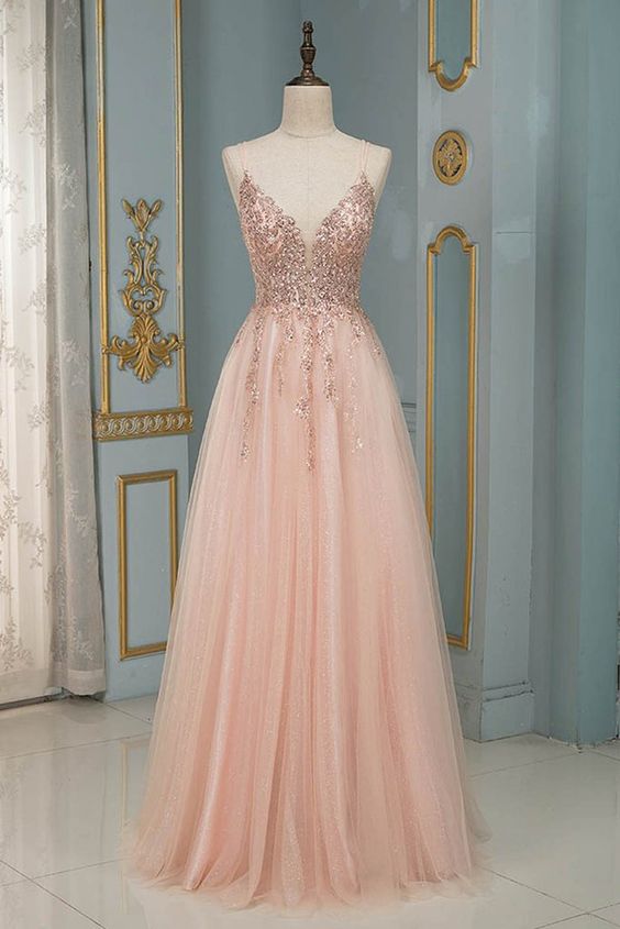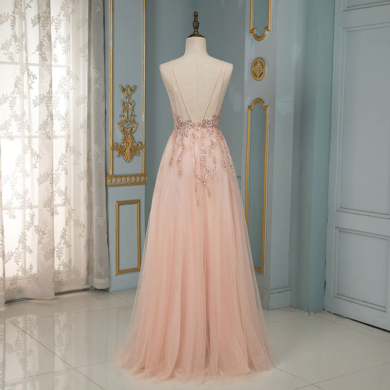 Blush Pink Tulle Long Prom Dresses Spaghetti Beaded Backless Evening Gowns,PD22030