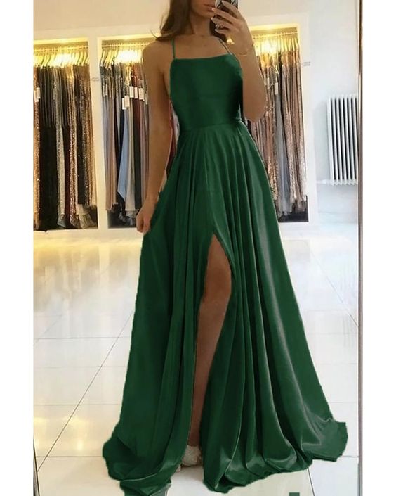 Amazing Spaghetti Straps Satin Sexy Slit Dark Green Prom Dress Long Party Gown,PD22066