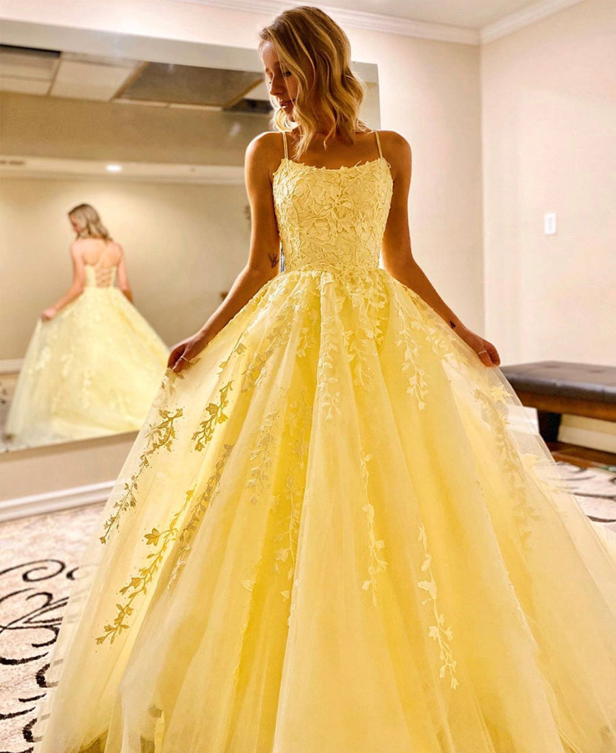 A Line Floor Length Lace Yellow Tulle Long Prom Dress, Yellow Lace Formal Dress, Yellow Evening Dress,PD22165