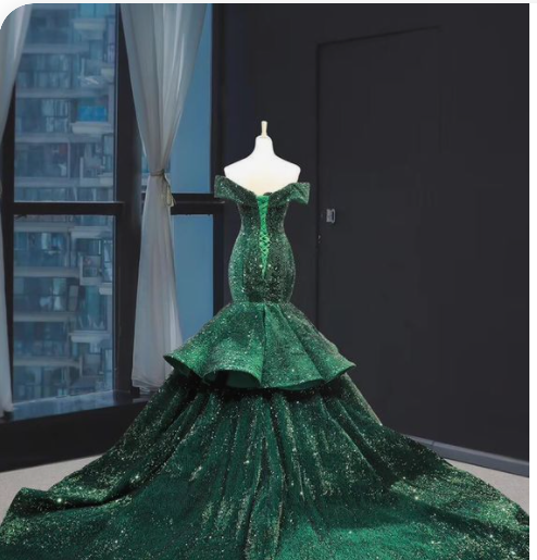 Green Mermaid Sequins Off the Shoulder Luxury Prom Dress With Train,PD22206