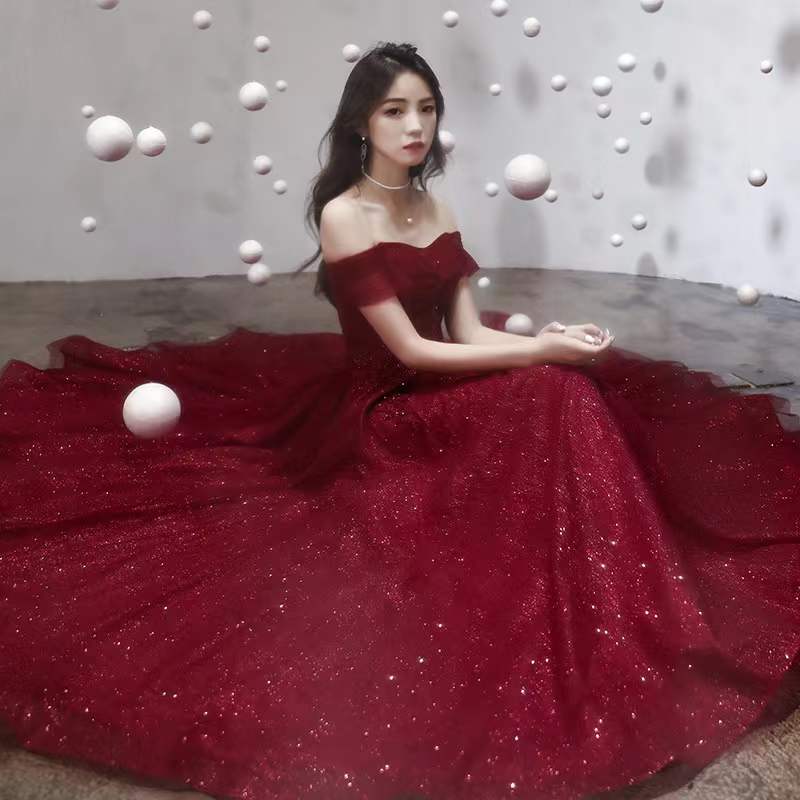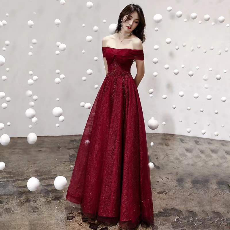 Burgundy tulle sequins long prom dress evening dress,PD22230