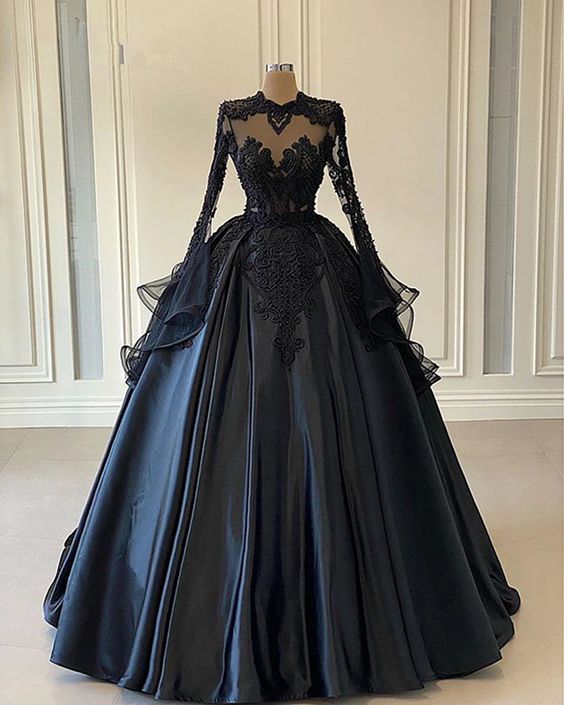 Ball Gown Black Long Sleeves Lace Prom Dresses,Beading Formal Evening Dresses,PD22329