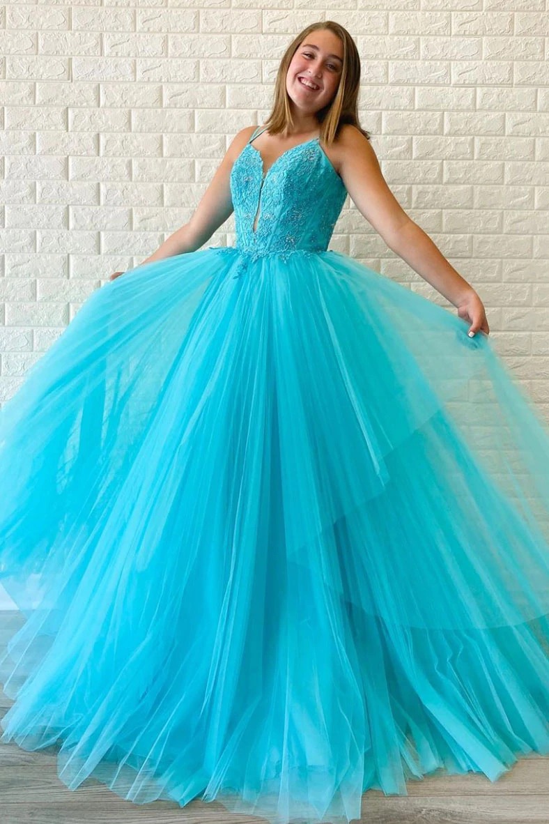 Blue v neck tulle long prom dress blue tulle formal dress,PD22929