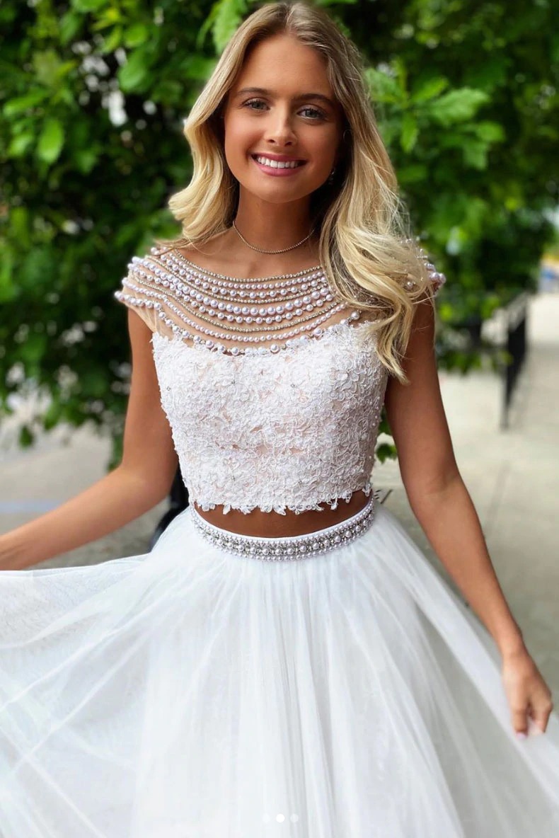 White round neck tulle lace two pieces long prom dress white formal dress,PD22993