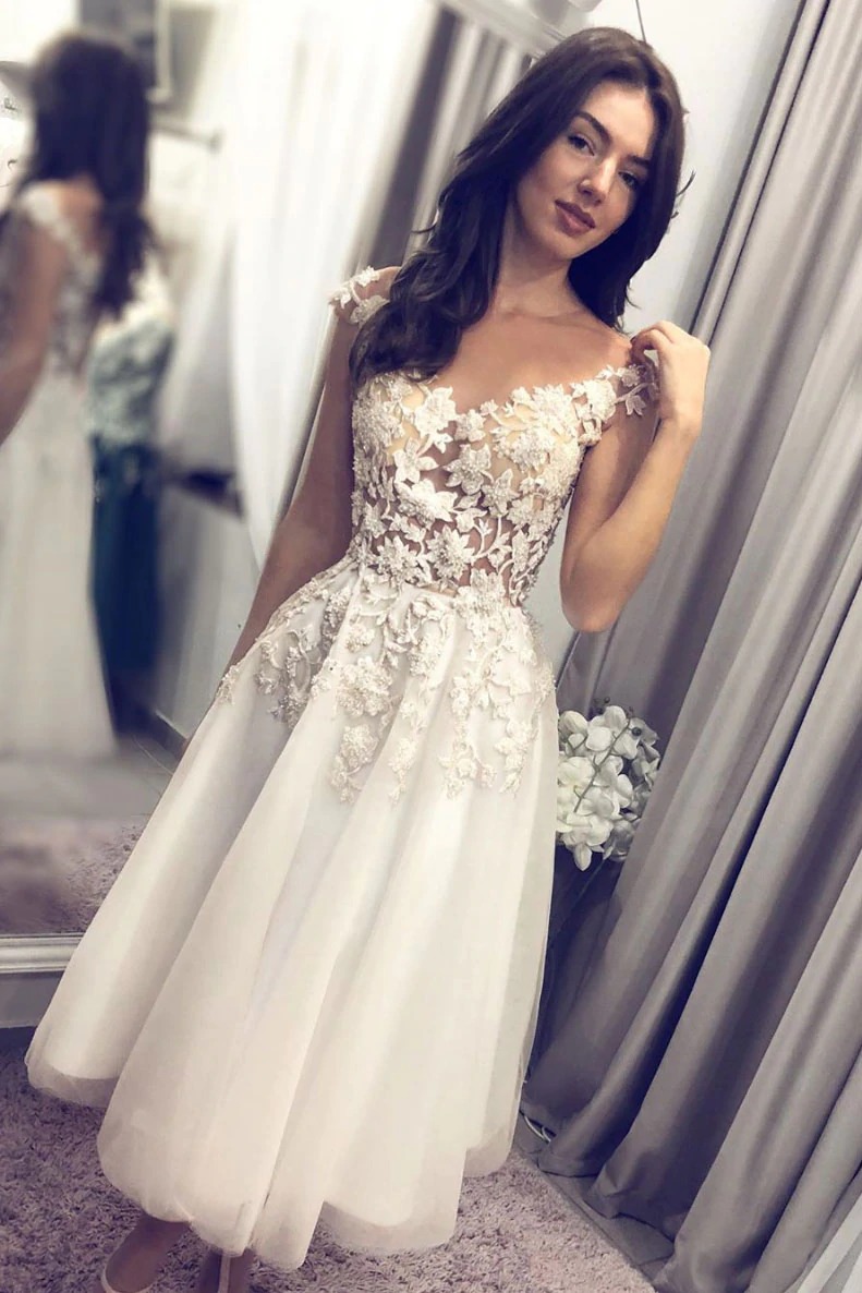 White tulle lace short prom dress lace bridesmaid dress,PD221133
