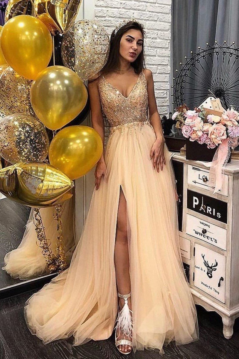 A Line Beaded Champagne Tulle V Neck Long Prom Dresses,PD221160