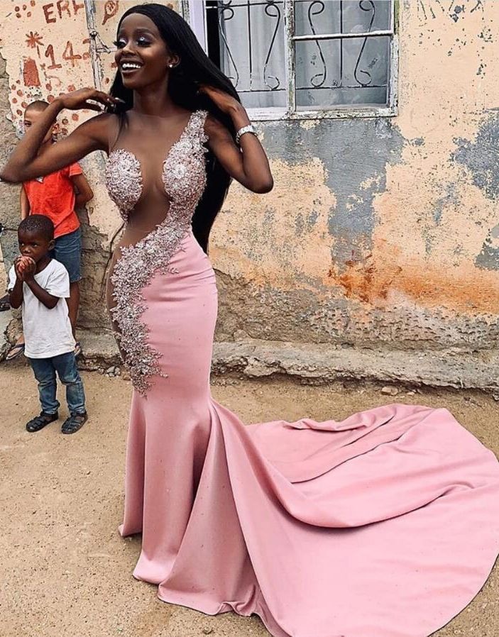 Mermaid Pink One Shoulder Beaded Train See Through Long Prom Dresses,PD221185
