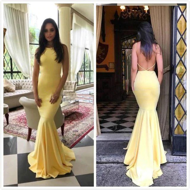 Sexy Mermaid Satin Light Yellow Backless Long Prom Dresses,PD221272