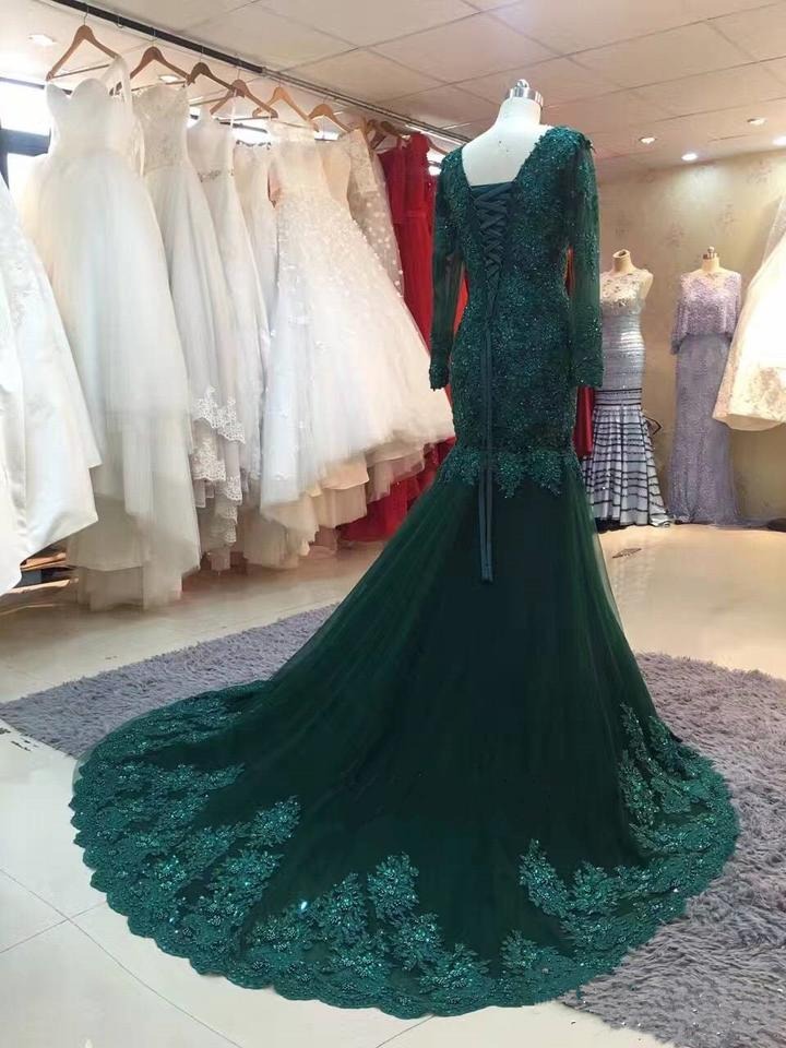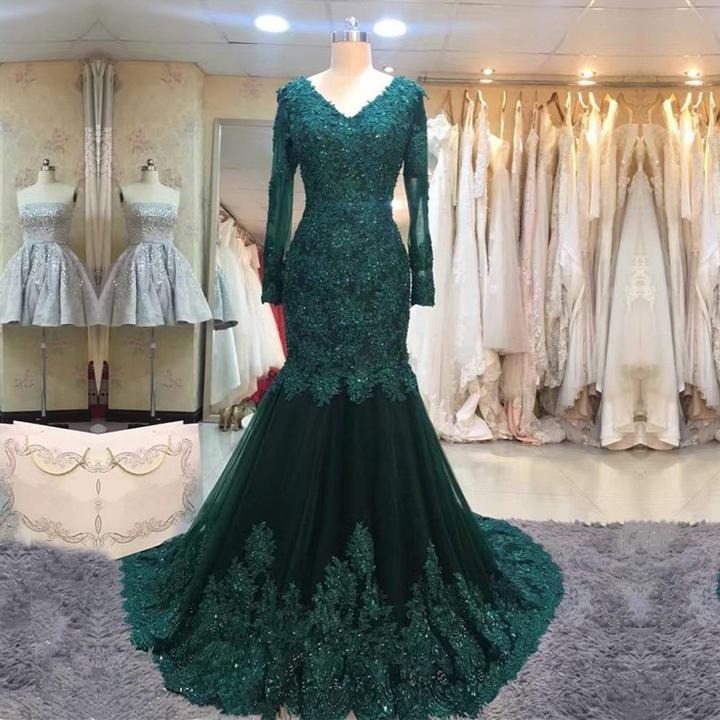 Mermaid Hunter Long Sleeves Tulle With Appliques V Neck Long Prom Dresses,PD221325