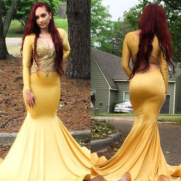 Mermaid Light Yellow Long Sleeves V Neck Elastic Satin Long Prom Dresses,PD221347