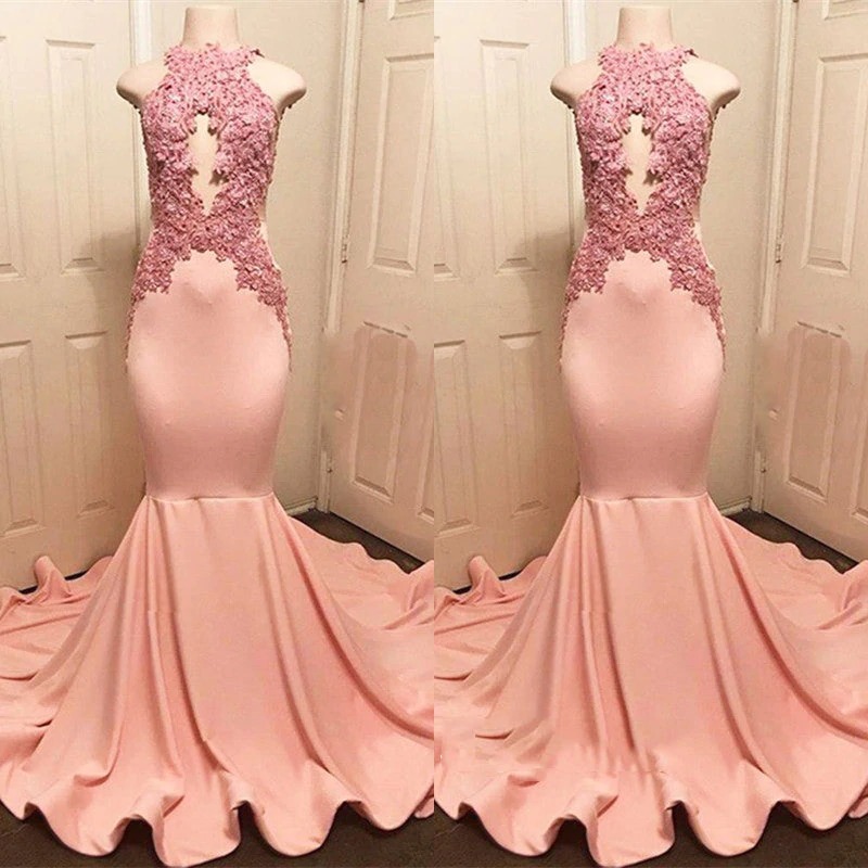 Mermaid Dusty Rose High Neck Backless With Appliques Long Prom Dresses,PD221353