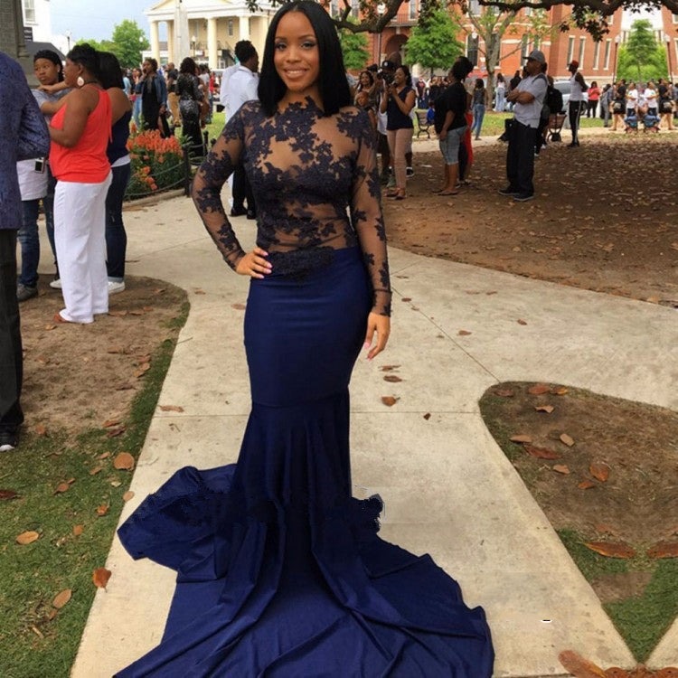 Dark Navy Mermaid Long Sleeves See Through Long Prom Dresses,PD221363