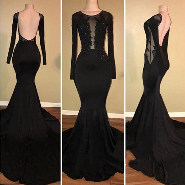 Black Mermaid See Through Long Sleeves Elastic Satin Backless Appliques Long Prom Dresses,PD221373