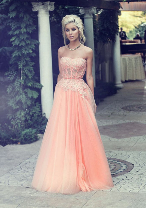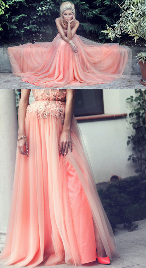 peach prom dress, long prom dress, charming prom dress, strapless prom dress, prom dress 2016, party prom dress, evening dress, E901