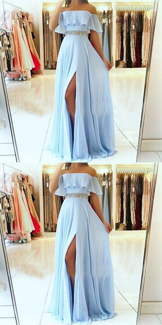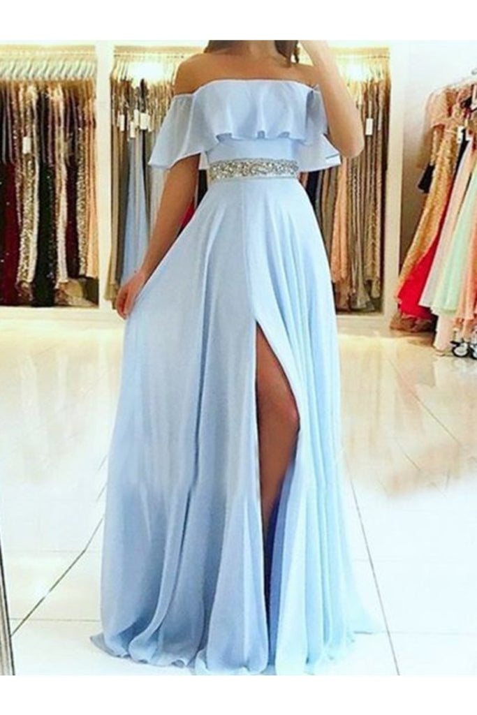 A-Line Off the Shoulder Split Front Blue Chiffon Prom Dress with Beading Belt,PD22104