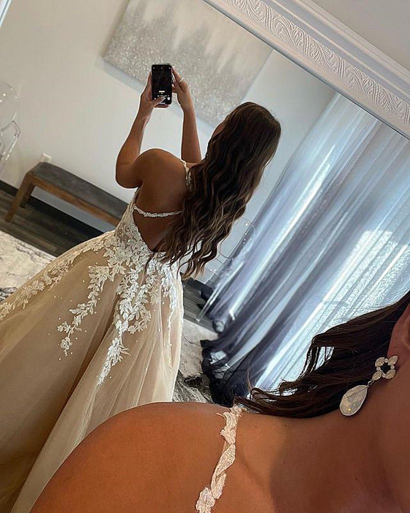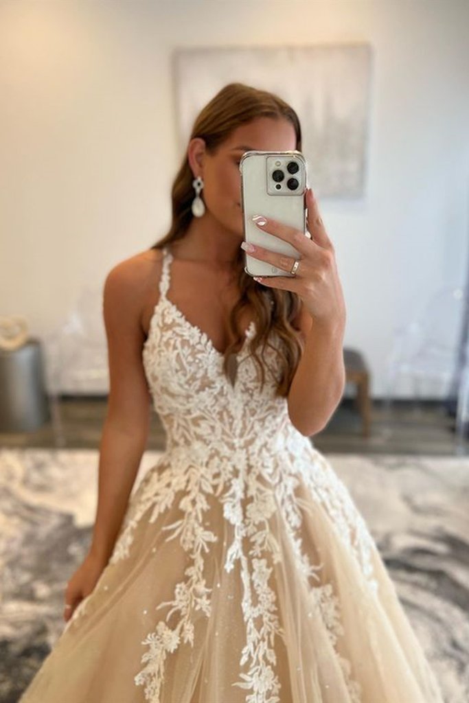 V Neck Champagne Lace Prom Dresses, Long Champagne Lace Formal Evening Dresses,PD22370