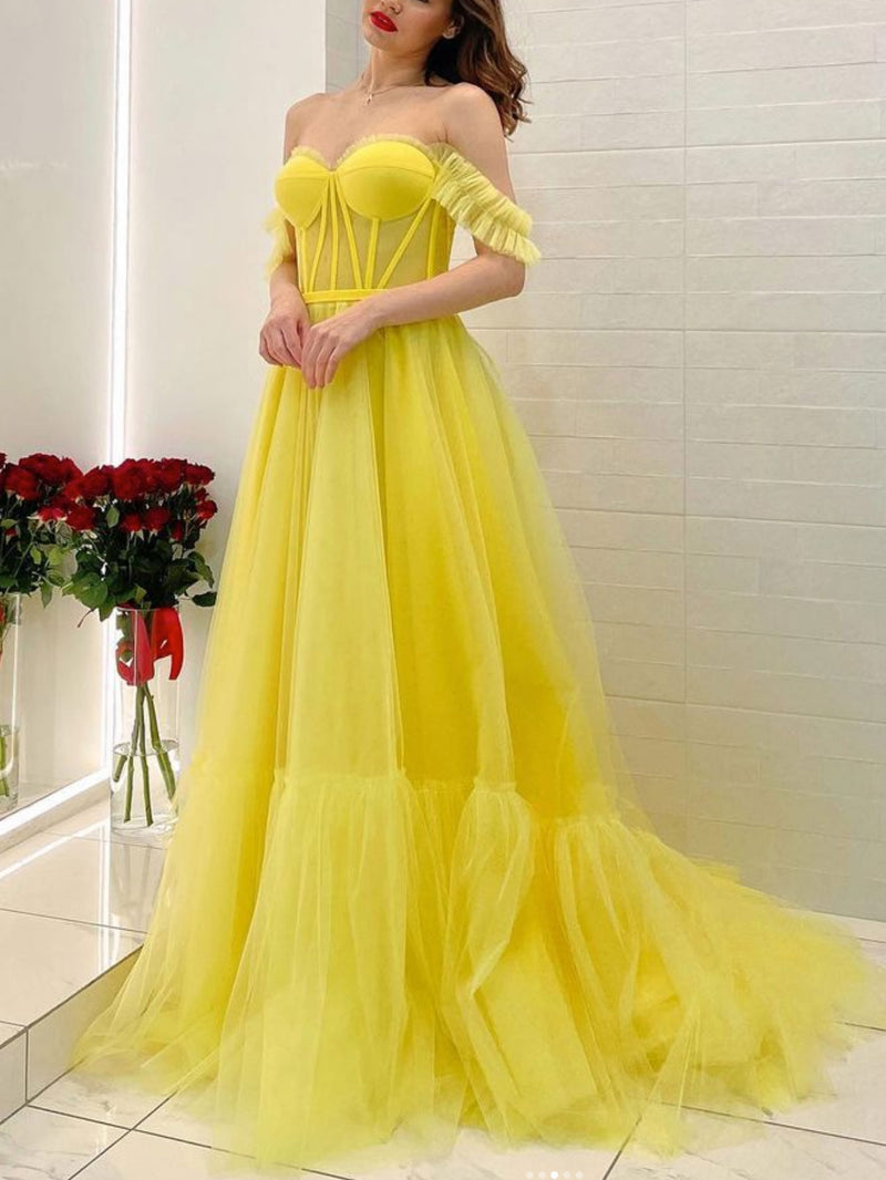 Yellow off shoulder tulle long prom dress, yellow tulle evening dress,PD22447