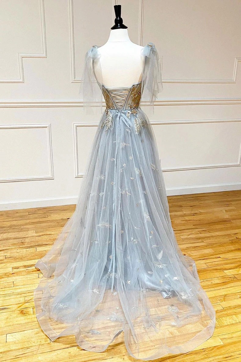 Gray v neck tulle sequin long prom dress gray tulle formal dress,PD221129