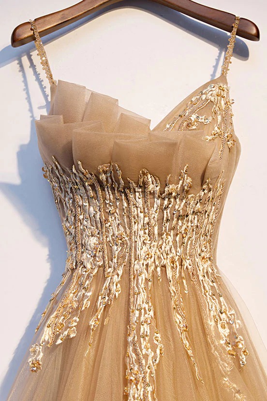 Champagne tulle lace long prom dress tulle lace formal dress,PD221145