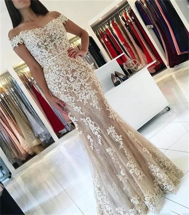 Amazing Mermaid Off Shoulder Sweetheart Tulle Champagne and White Appliques Long Prom Dress,PD221208