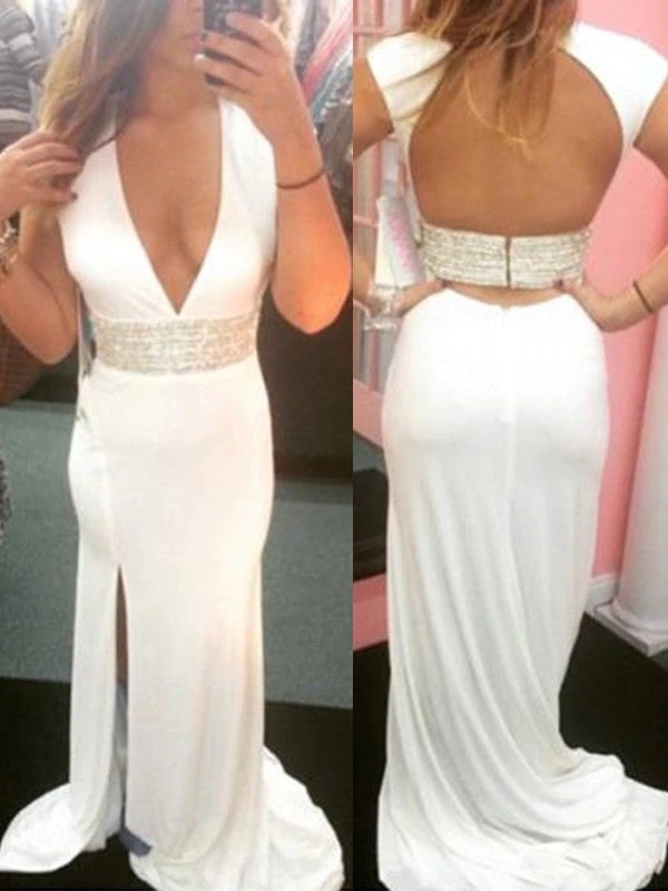 Amazing White Sheath V Neck Side Slit Backless Long Prom Dress,PD221236