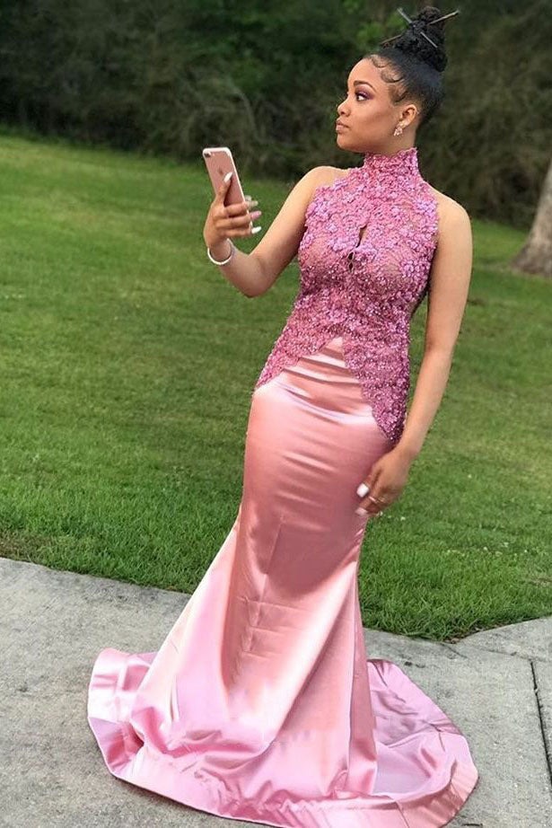 New Arrival Mermaid Pink Elastic Satin High Neck South African Long Prom Dress,PD221239