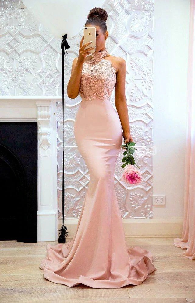 Sexy Mermaid Pink High Neck Backless Satin Long Prom Dresses,PD221318