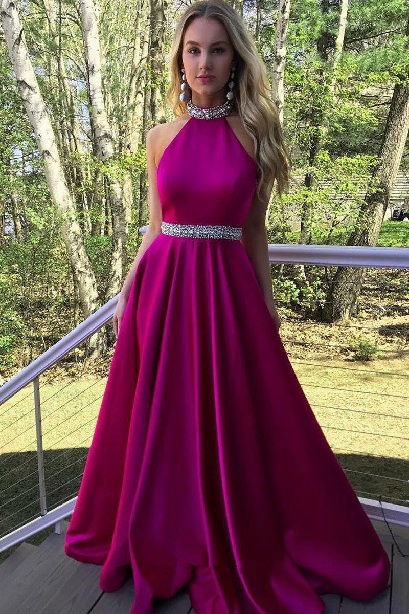 New Arrival A Line Satin Halter Beaded Backless Hot Pink Long Prom Dresses,PD221335
