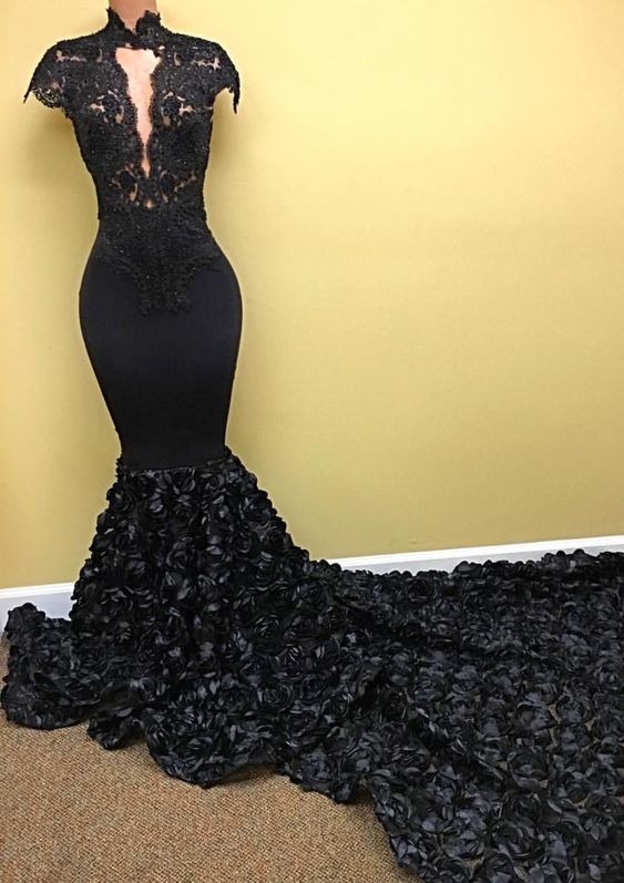 Sexy Mermaid Black Womens High Neck Key Hole Rose Capped Sleeves Long Prom Dresses,PD221341