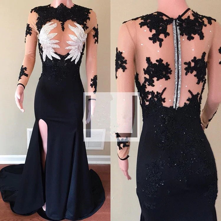 Black Sheath Long Sleeves See Through Side Slit Satin Long Prom Dresses,PD221386