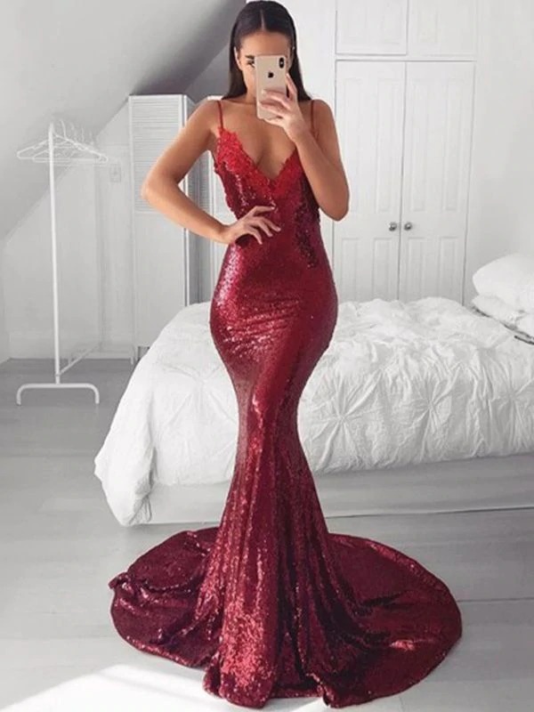 Mermaid Burgundy Sequence Backless Spaghetti Straps Long Prom Dresses,PD221440