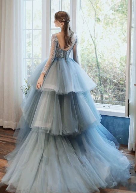 blue round neck tulle sequin long prom gown blue formal dress,PD221484