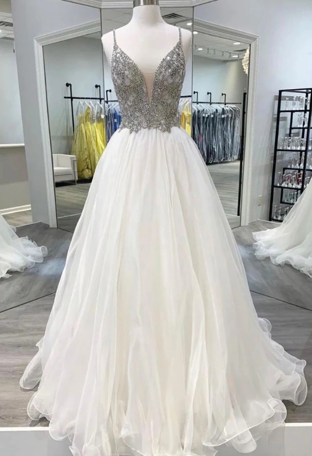 White v neck tulle long prom dress white tulle formal dress,PD221495