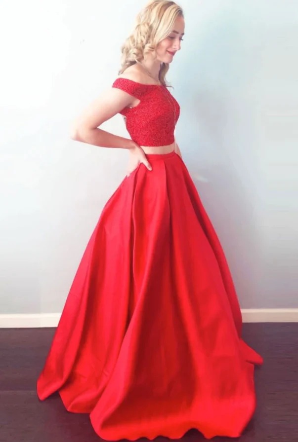Red two pieces satin long prom dress red long evening dress,PD221542