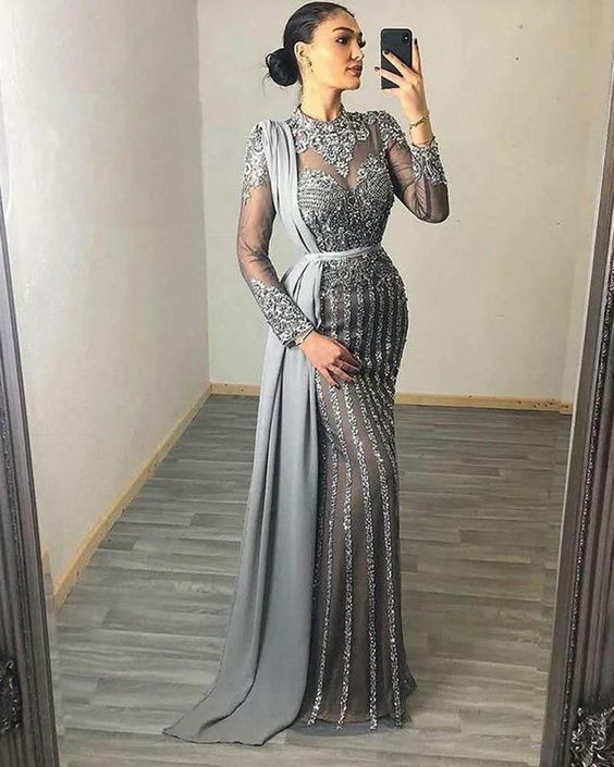 muslim beading evening dresses high neck dubai long sleeve prom gown mermaid Evening Dresses Fall Wedding Dresses,PD221553
