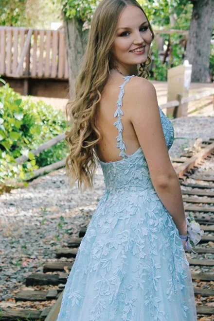 A-Line V-Neck Sleeveless Spaghetti Straps Light Blue Lace Long Prom Dresses,PD221671