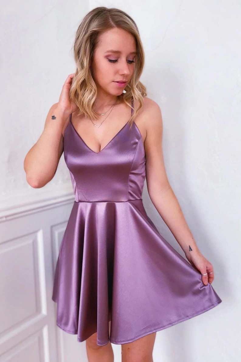 Simple purple v neck satin short prom dress homecoming dress,PD221075