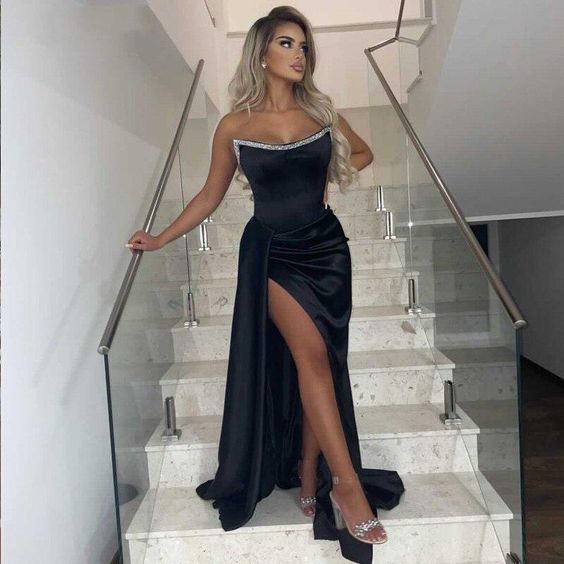 Elegant High Side Split Mermaid Evening Dresses Black Scoop Satin Prom Gown,PD22037