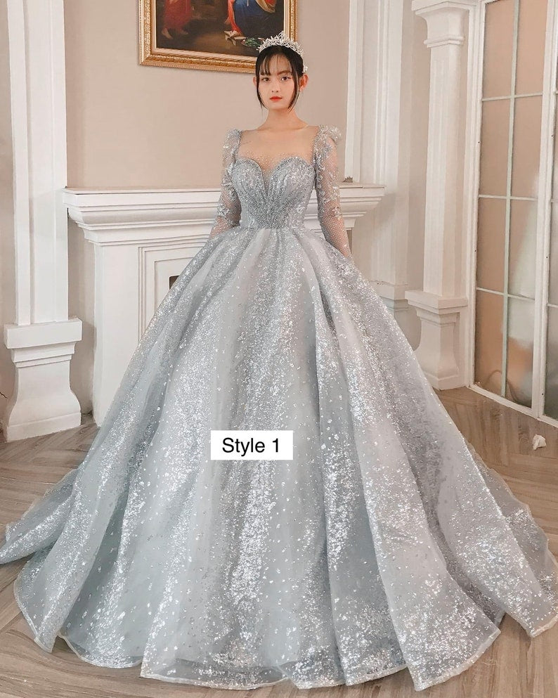 Modern sparkly grey/silver long or cap sleeves ball gown wedding/prom dress with glitter tulle,PD22183
