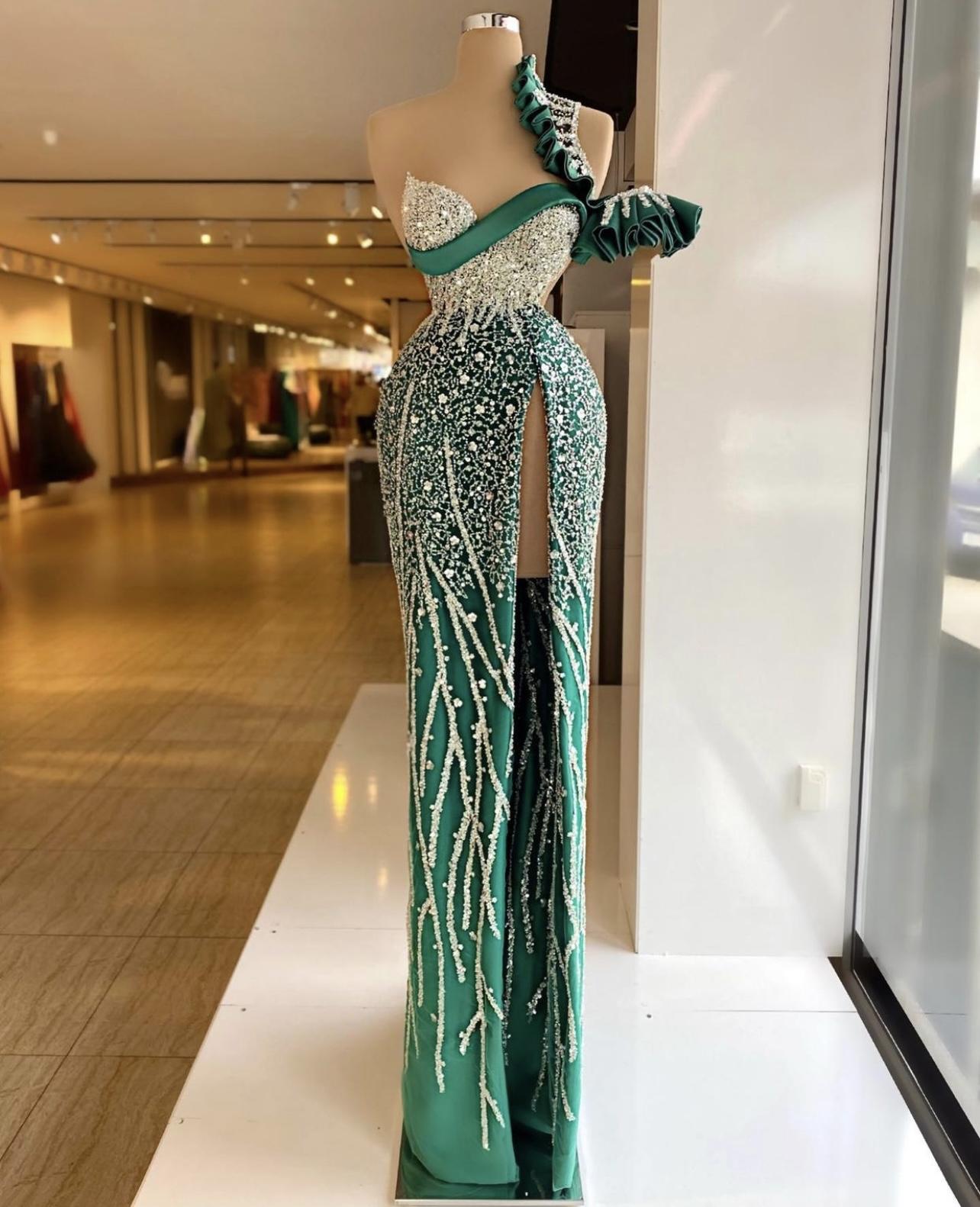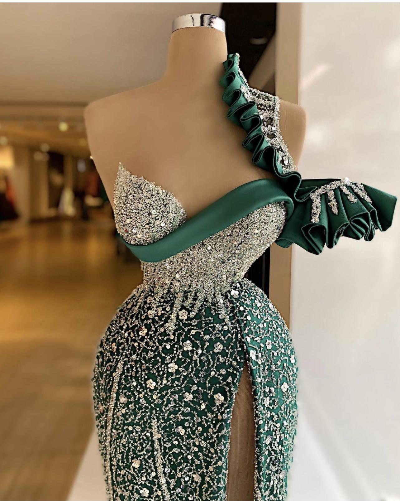 One Shoulder Green Mermaid Evening Dresses Crystal Beaded High Side Split Formal Prom Gowns Custom Made Plus Size Pageant Wear Party Dress,PD22249