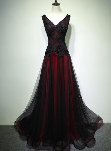Gorgeous Black And Red V-Neckline Tulle Beaded Prom Dress, Long Evening Gown,PD22289