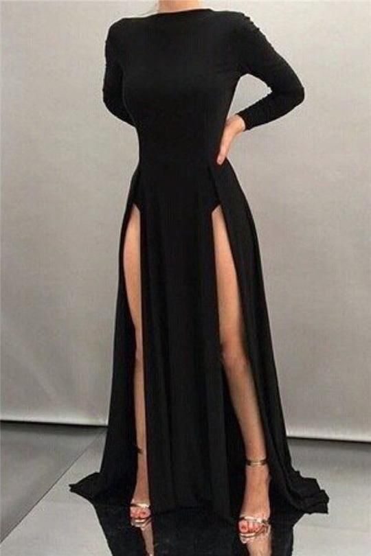 Black Sexy Evening Dresses With Long Sleeves, High Split Sexy Prom Dress,PD22326