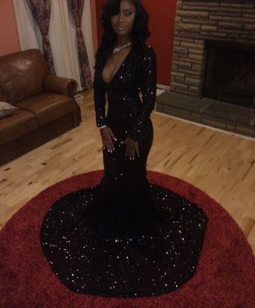 Sparkly Sequins Long Sleeve Deep V-Neck Black Prom Dresses,PD22384