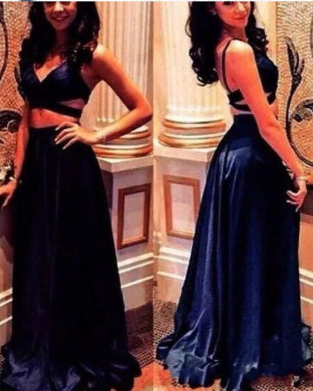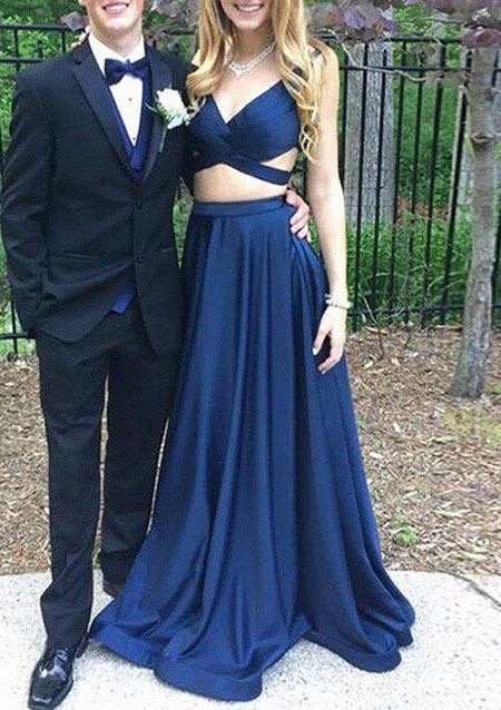 Cheap A Line Dark Navy Satin Sweetheart Two Pieces Long Prom Dresses,PD221284