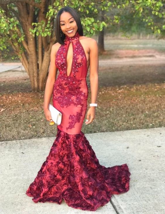 Mermaid Key Hole Rose Backless Black Womens Long Prom Dresses,PD221320