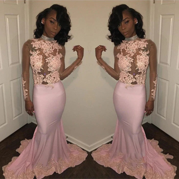 Cheap Pink Sheath See Through Long Sleeves African Long Prom Dresses,PD221358