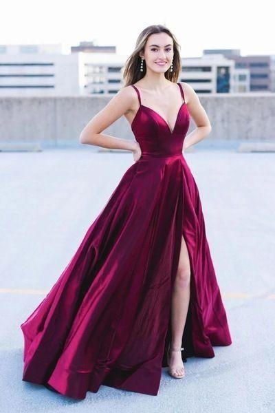 Burgundy V-neck Split Slit Long Prom Dress, Backless Evening Dress,PD221482