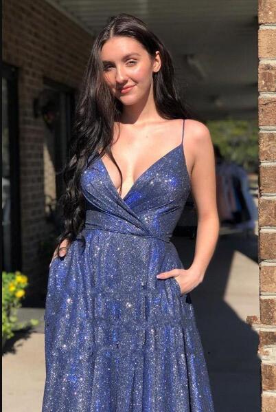 Sparkly V Neck Straps A-Line Long Prom Dresses, Evening Dresses,PD221601
